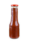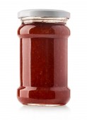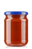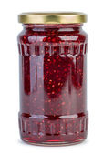 Szklany słoik z dżemem truskawkowym izolowany na białym tle