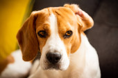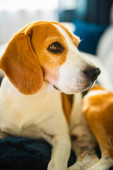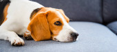Młody brązowy pies śpiący na kanapie - słodkie zdjęcie zwierząt domowych.