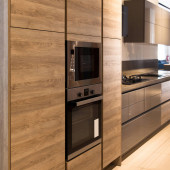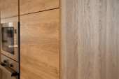 Zdjęcie "Nowoczesny minimalny budynek piekarnika z drewnianymi meblami w kuchni z pełnym zielonym drzewem bokeh szklane okno obok dla miejsca kopiowania reklama projekt." może być wykorzystywane do celów osobistych i komercyjnych zgodnie z warunkami zakupionej licencji Royalty-free. Obraz jest dostępny do pobrania w jakości wysokiej rozdzielczości do 5760x3840.