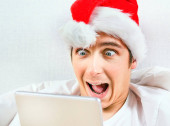 na świątecznym żółtym tle mężczyzna trzymający telefon w rękach i trzymający ramiona w górze