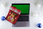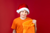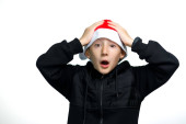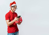 Mężczyzna w czapce Świętego Mikołaja wygląda na zszokowanego telefonem.