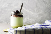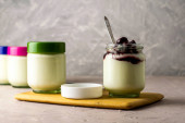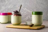 słoik jogurtu z dżemem wiśniowym na desce do krojenia obok ręcznika