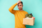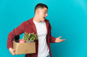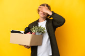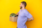 Zdjęcie "Młody biały robi ruch, podnosząc pudełko pełne rzeczy odizolowanych na żółtym tle, zrozumiał coś i zamierzając to rozwiązać." może być wykorzystywane do celów osobistych i komercyjnych zgodnie z warunkami zakupionej licencji Royalty-free. Obraz jest dostępny do pobrania w jakości wysokiej rozdzielczości do 5760x3840.