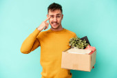 Młody biały robi ruch, podnosząc pudełko pełne rzeczy odizolowanych na żółtym tle, zrozumiał coś i zamierzając to rozwiązać.