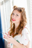 zbliżenie obrazu pinup dziewczyny piękne blond kobieta młody zabawy, wskazując od szczęśliwy uśmiechający się patrząc na słońce oświetlenie tła okna