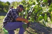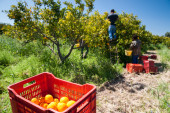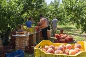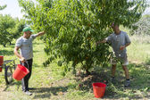pracowników zbierania brzoskwinie z drzew w fabryce maszyn