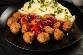 Klopsiki Lihapullat z tłuczonymi ziemniakami i dżemem borówkowym zbliżenie w talerzu na stole. Horyzonta