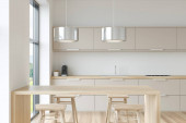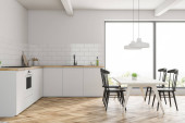 Zdjęcie "Narożny widok na biały i jasny beżowy wnętrze kuchni z okrągłym stołem z czterema krzesłami, stalowe szczegóły i bar śniadaniowy. Drewniana podłoga. Koncepcja nowoczesnego designu domu. 3d renderowanie" może być wykorzystywane do celów osobistych i komercyjnych zgodnie z warunkami zakupionej licencji Royalty-free. Obraz jest dostępny do pobrania w jakości wysokiej rozdzielczości do 5760x3840.
