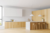Narożny widok na biały i jasny beżowy wnętrze kuchni z okrągłym stołem z czterema krzesłami, stalowe szczegóły i bar śniadaniowy. Drewniana podłoga. Koncepcja nowoczesnego designu domu. 3d renderowanie