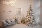 białe wnętrze Boże Narodzenie z choinką noworoczną urządzone. Złota pufa, tekstylia, prezenty pod choinką
