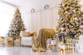 Zdjęcie "białe wnętrze Boże Narodzenie z choinką noworoczną urządzone. Złota pufa, tekstylia, prezenty pod choinką" może być wykorzystywane do celów osobistych i komercyjnych zgodnie z warunkami zakupionej licencji Royalty-free. Obraz jest dostępny do pobrania w jakości wysokiej rozdzielczości do 5760x3840.