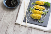 Zdjęcie "Dimsum z różnymi dodatkami, podawane z pikantnym sosem. Selektywny obraz ostrości, zbliżenie." może być wykorzystywane do celów osobistych i komercyjnych zgodnie z warunkami zakupionej licencji Royalty-free. Obraz jest dostępny do pobrania w jakości wysokiej rozdzielczości do 5760x3840.