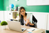 Zdjęcie "Kolor obrazu. Latynoski nauczyciel czuje się dumny i pokazuje online pracę domową dzieci podczas wirtualnej lekcji " może być wykorzystywane do celów osobistych i komercyjnych zgodnie z warunkami zakupionej licencji Royalty-free. Obraz jest dostępny do pobrania w jakości wysokiej rozdzielczości do 5760x3840.