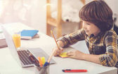 Kolor obrazu. Latynoski nauczyciel czuje się dumny i pokazuje online pracę domową dzieci podczas wirtualnej lekcji