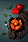 Smażone ziemniaki z nogami kurczaka, na brązowym drewnianym stole, poziomo, bez ludzi,