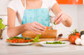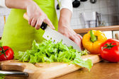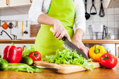 młoda kobieta krojenie warzyw w kuchni
