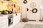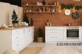 Wnętrze jasnej kuchni urządzone na Boże Narodzenie z licznikami