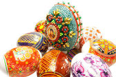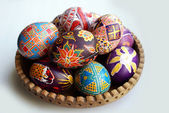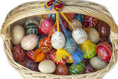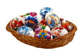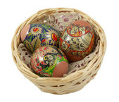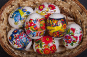 bliska trzy jaja wielkanocne w wiklinowym koszu nad białym