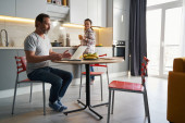 Zdjęcie "Happy uśmiechnięta brunetka kobieta i przystojny mężczyzna pracuje online w kuchni" może być wykorzystywane do celów osobistych i komercyjnych zgodnie z warunkami zakupionej licencji Royalty-free. Obraz jest dostępny do pobrania w jakości wysokiej rozdzielczości do 5760x3840.