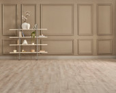 Brązowy tło ściany z białą książką ornament wikliny i bujany krzesło dywan i lampa.