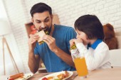 Portret małego chłopca i jego ojca siedzących przy stole podczas śniadania w domu w kuchni.