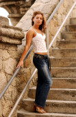 biały top - niebieskie dżinsy - palmowe drzewo chodnik