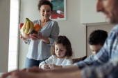 Zdjęcie "Wesoły ojciec i jego synek pomagają sobie podczas przygotowywania sałatki siedzącej przy stole w domu w kuchni." może być wykorzystywane do celów osobistych i komercyjnych zgodnie z warunkami zakupionej licencji Royalty-free. Obraz jest dostępny do pobrania w jakości wysokiej rozdzielczości do 5760x3840.