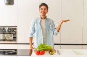 Zdjęcie "Młody mieszany człowiek rasy przygotowuje sałatkę na lunch mając jakiś świetny pomysł, koncepcja kreatywności." może być wykorzystywane do celów osobistych i komercyjnych zgodnie z warunkami zakupionej licencji Royalty-free. Obraz jest dostępny do pobrania w jakości wysokiej rozdzielczości do 5760x3840.