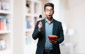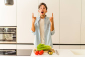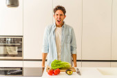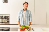 Młody mieszany człowiek rasy przygotowuje sałatkę na lunch mając jakiś świetny pomysł, koncepcja kreatywności.