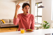 Młody człowiek rasy mieszanej je śniadanie w kuchni rano próbuje słuchać plotek.