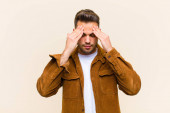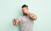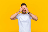 młody przystojny mężczyzna uśmiecha się i czuje szczęśliwy, zakrywając oczy obiema rękami i czekając na niewiarygodną niespodziankę