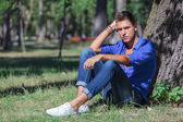 mężczyzna odpoczynek na chodniku i wygląda na swoją stronę
