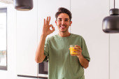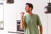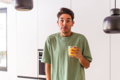 Młody mieszany człowiek pijący sok pomarańczowy w swojej kuchni mówi sekretną wiadomość o gorącym hamowaniu i odwraca wzrok.