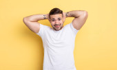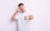 młody przystojny mężczyzna uśmiecha się wesoło i wskazując na aparat podczas wykonywania telefonu później gest, rozmawiając przez telefon