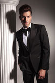 moda mężczyzna w prowokacyjne pozy palcem na wardze