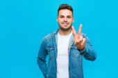 młody przystojny mężczyzna uśmiecha się i wygląda przyjaźnie, pokazując numer trzy lub trzeci z ręką do przodu, odliczając w dół