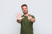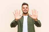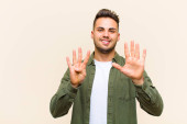 młody przystojny mężczyzna uśmiecha się i wygląda przyjaźnie, pokazując numer dziesięć lub dziesięć z ręką do przodu, odliczając w dół