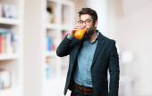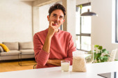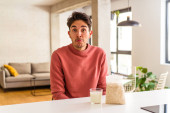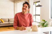 młody mieszane wyścig człowiek jedzenie owsianki i mleka na śniadanie w jego kuchni