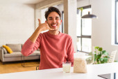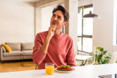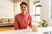 Zdjęcie "młody mieszane wyścig człowiek jedzenie owsianki i mleka na śniadanie w jego kuchni" może być wykorzystywane do celów osobistych i komercyjnych zgodnie z warunkami zakupionej licencji Royalty-free. Obraz jest dostępny do pobrania w jakości wysokiej rozdzielczości do 5760x3840.