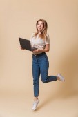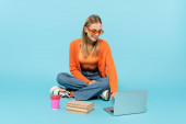 pełny widok długości uśmiechnięta kobieta w pomarańczowej kurtce i dżinsy za pomocą laptopa na zielono