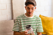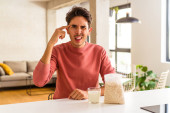 młody mieszane wyścig człowiek jedzenie owsianki i mleka na śniadanie w jego kuchni