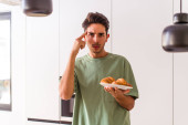 Młody mieszaniec rasy jadł rogaliki w kuchni rankiem będąc w szoku, przypomniała sobie ważne spotkanie.
