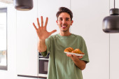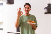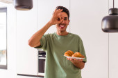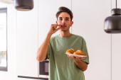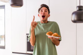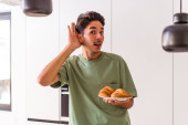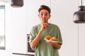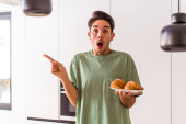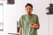 Zdjęcie "Młody mieszaniec rasy jadł rogaliki w kuchni rankiem będąc w szoku, przypomniała sobie ważne spotkanie." może być wykorzystywane do celów osobistych i komercyjnych zgodnie z warunkami zakupionej licencji Royalty-free. Obraz jest dostępny do pobrania w jakości wysokiej rozdzielczości do 5760x3840.