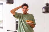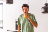 młody mieszany rasa człowiek pije sok pomarańczowy w jego kuchni obgryzając paznokcie, nerwowy i bardzo niespokojny.