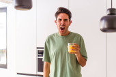 Zdjęcie "młody mieszany rasa człowiek pije sok pomarańczowy w jego kuchni obgryzając paznokcie, nerwowy i bardzo niespokojny." może być wykorzystywane do celów osobistych i komercyjnych zgodnie z warunkami zakupionej licencji Royalty-free. Obraz jest dostępny do pobrania w jakości wysokiej rozdzielczości do 5760x3840.