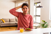 Młody człowiek rasy mieszanej je śniadanie w swojej kuchni mając jakiś świetny pomysł, koncepcja kreatywności.