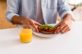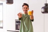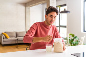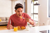 młody mieszane rasa człowiek jedzenie croissant w kuchnia w w w rano