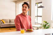 Zdjęcie "Młody mieszany człowiek rasy jedzenie owsianki i mleka na śniadanie w jego kuchni marzy o osiągnięciu celów" może być wykorzystywane do celów osobistych i komercyjnych zgodnie z warunkami zakupionej licencji Royalty-free. Obraz jest dostępny do pobrania w jakości wysokiej rozdzielczości do 5760x3840.