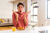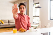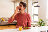 Zdjęcie "Młody mieszane wyścigu człowiek je śniadanie w kuchni na rano podnosząc pięść po zwycięstwie, koncepcja zwycięzcy." może być wykorzystywane do celów osobistych i komercyjnych zgodnie z warunkami zakupionej licencji Royalty-free. Obraz jest dostępny do pobrania w jakości wysokiej rozdzielczości do 5760x3840.