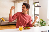Młody mieszane wyścigu człowiek je śniadanie w kuchni na rano podnosząc pięść po zwycięstwie, koncepcja zwycięzcy.